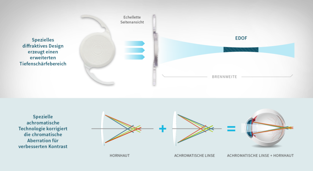 EDof steht für Extended Depht Of Focus und bedeutet so viel wie erweiterte Tiefenschärfe. Diese entsteht durch das Ineinanderlaufen der beiden Brennpunkte (siehe Grafik). Damit werden optische Nebenwirkungen weitestgehend vermieden und die Brillenunabhängigkeit im Alltag wird ermöglicht.