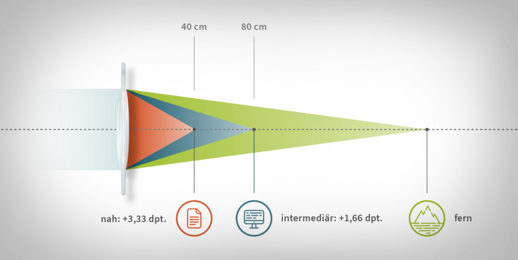 Diese neue Technologie ermöglicht durch einen optischen „Trick“ ein komfortables Sehen bis zum intermediären Bereich ohne optische Nebenwirkungen. So kann man zum Beispiel am Tablet problemlos lesen.